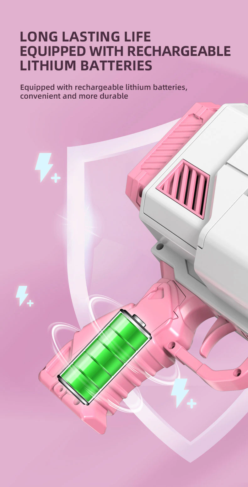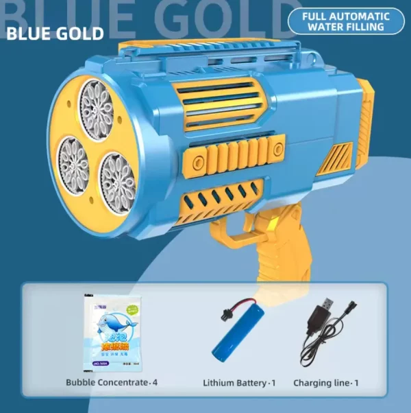 The Bubble Guns Kit includes 1 Rocket Bubble Gun, 4 bottles of Bubble Solution, and a high-quality lithium battery. The machine is straightforward to use and attach, making it user-friendly for kids and adults. The sturdy construction promises durability and a barrage of bubbles, while the superior quality assures long-lasting performance.